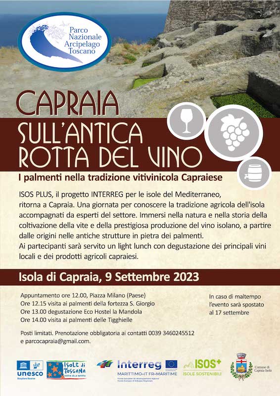 Il Parco Nazionale Arcipelago Toscano, partner di un progetto INTERREG Italia-Francia, organizza un’escursione a Capraia per conoscere la tradizione agricola capraiese, con la compagnia di alcuni esperti del settore. Immersi nella natura e nella storia della coltivazione della vite e della prestigiosa produzione del vino isolano, a partire dalle sue origini nelle antiche strutture in pietra dei palmenti. Queste opere sono testimonianza dell’antica vitivinicoltura praticata in modo costante e continuativo a partire dal XVI secolo, periodo in cui fonti documentarie la riportano in posizione privilegiata rispetto alla complessiva e limitata produzione agricola praticata sull’isola.