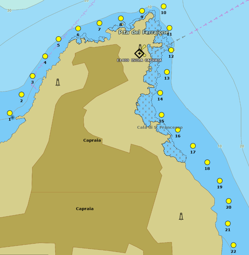 di segnalazione luminosa notturna) sono state collocate ad una distanza di 50 mt l’una dall’altra lungo una linea immaginaria che si sviluppa davanti all’abitato di Capraia, tra la zona estrema a sud del porto, poco prima della Grotta sotto la Torre (accessibile a tutti da terra), e la Torretta al Bagno, anch’essa accessibile da terra, con un tragitto lungo circa 1100mt e largo circa 20-25 mt. Il percorso in andata e ritorno consente di nuotare praticamente per un miglio nautico.