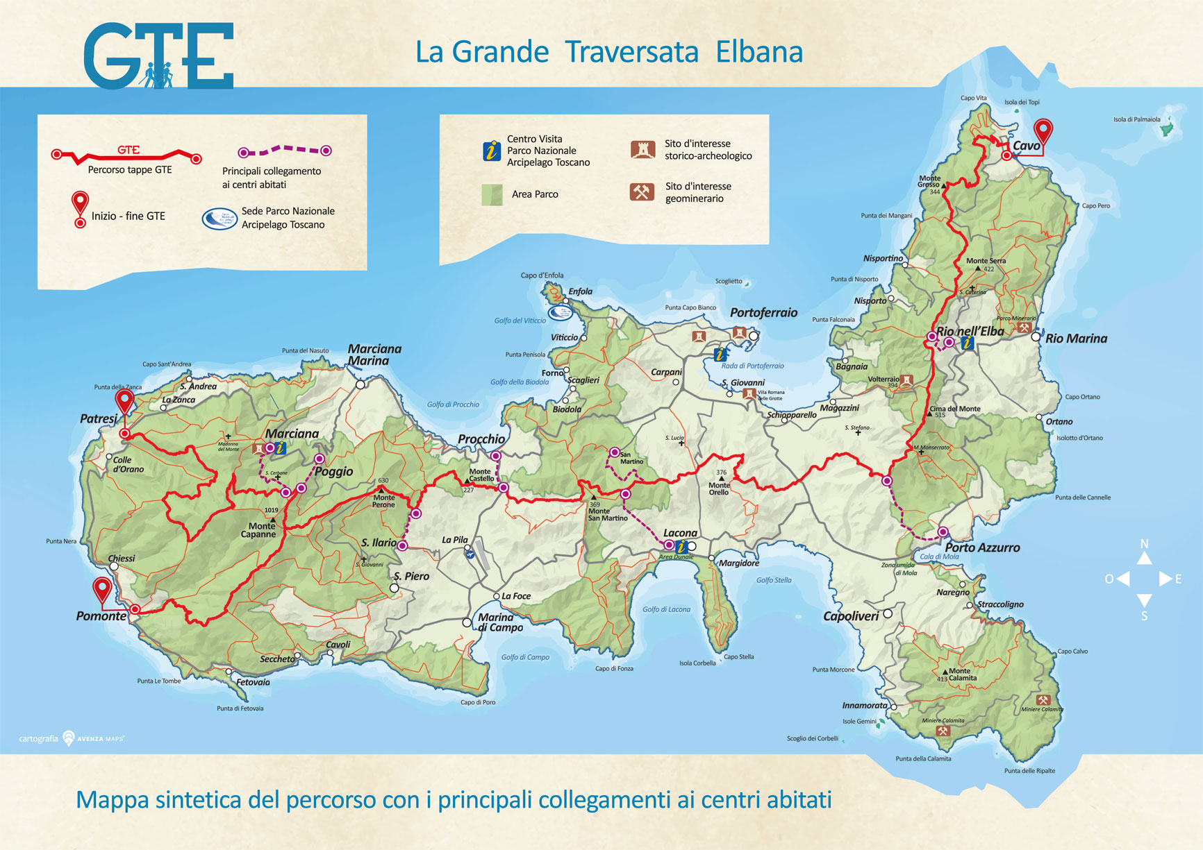 Il percorso “classico” è strutturato in 4 tappe con pernottamenti a Porto Azzurro, Procchio e Poggio. Questa soluzione consente di scoprire con calma i molti punti di interesse che si trovano lungo il tracciato. E’ anche possibile camminare per un’intera settimana esplorando alcuni dei percorsi che partono dalla GTETuttavia in relazione al tempo disponibile, all’allenamento e all’ubicazione delle strutture ricettive dove si intende pernottare ci possono essere diverse alternative sia al numero delle tappe che al tracciato. Anche il senso di marcia può essere da ovest a est (da Pomonte o Patresi a Cavo) invece che viceversa. Alcuni escursionisti preferiscono dividere il percorso nelle seguenti 3 tappe :